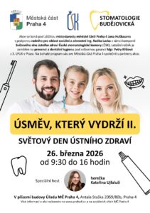 Městská část Prahy 4 společně se Stomatologií Budějovická zve na druhý ročník preventivně-vzdělávací a zábavné akce Úsměv, který vydrží. Letos na téma ústní hygieny pod odborným vedením Mgr. Petry Křížové z 3. LF UK. Program je součástí Světového dne ústního zdraví s podtitulem Šťastná ústa jsou… šťastný život. Speciálním hostem bude herečka Kateřina Ujfaluši.